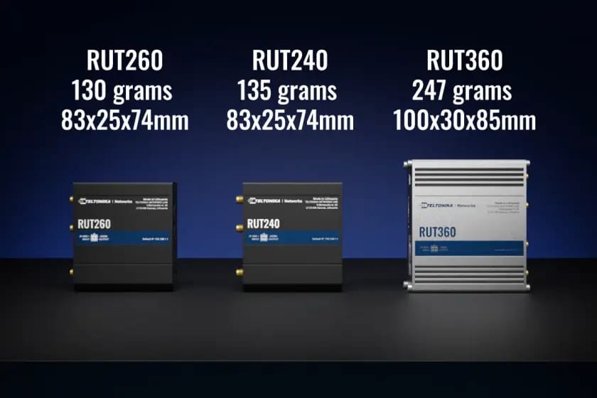 Estas son las mismas dimensiones que el RUT240, con la pequeña adición de 5 gramos. Por el contrario, el RUT360 pesa 247 gramos más con 100 x 30 x 85 mm. En otras palabras, el RUT260 tiene la potencia LTE Cat 6 del RUT360, pero es más pequeño y pesa casi un 50 % más.