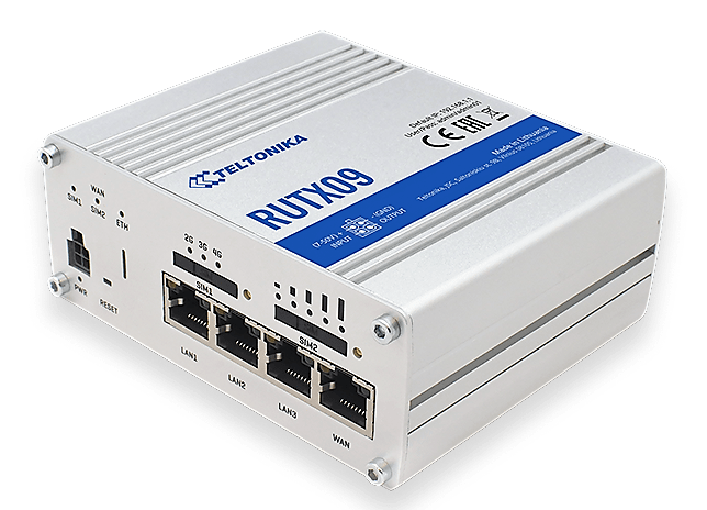 El RUTX09 de Teltonika es el primero de una nueva generación de routers más potentes y con mayores prestaciones que las familias RUT9XX y RUT2XX. Equipa un microprocesador Quad Core ARM 7 a 717MHz y 256MB de RAM. Asimismo, dispone de un módulo LTE CAT6 capaz de alcanzar velocidades de bajada de hasta 300Mbps y está equipado con 4 puertos Gigabit Ethernet. Dispone de dos SIM pudiendo usar una como backup de la otra (sin bonding simultáneo) aunque sí permite balancear el tráfico entre la interfaz LTE y la interfaz WAN RJ45.