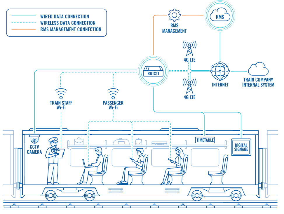 Dentro de los trenes de pasajeros, RUTX11 creará un punto de acceso Wi-Fi fiable para que los pasajeros disfruten de las posibilidades de trabajo y entretenimiento sobre la marcha. Además, proporcionará a la operación del tren los beneficios de la Industria 4.0, como sistemas de CCTV alimentados por conectividad, señalización digital, comunicación remota del personal y más.