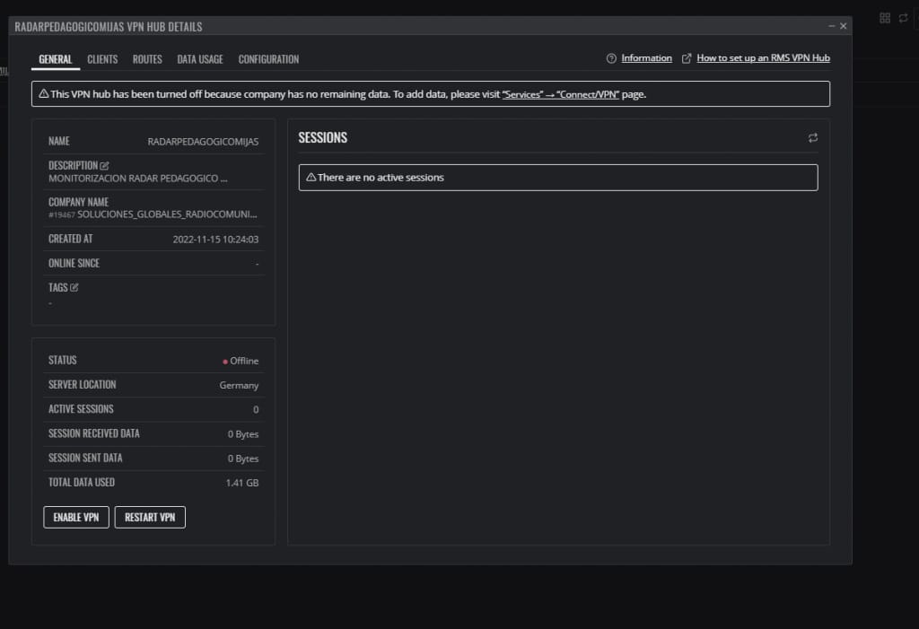 Recuerda que con cada cuenta RMS Teltonika te regala 5GB de tráfico VPN. Si has agotado estos 5GB tus HUBS VPN dejarán de funcionar y al arrancarlos obtendrás un mensaje de error.