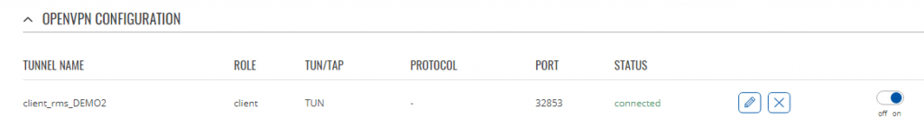 Si entramos en la configuración del router en el apartado OpenVPN veremos el cliente descargado a partir de nuestro HUB. Podemos ver que está conectado pero no podemos identificar el túnel al que corresponde. El nombre de túnel se corresponde con la descripción genérica de nuestro hub (DEMO2) pero podríamos llegar a borrarlo y crear otro hub con el mismo nombre que tendría un identificar de túnel diferente.