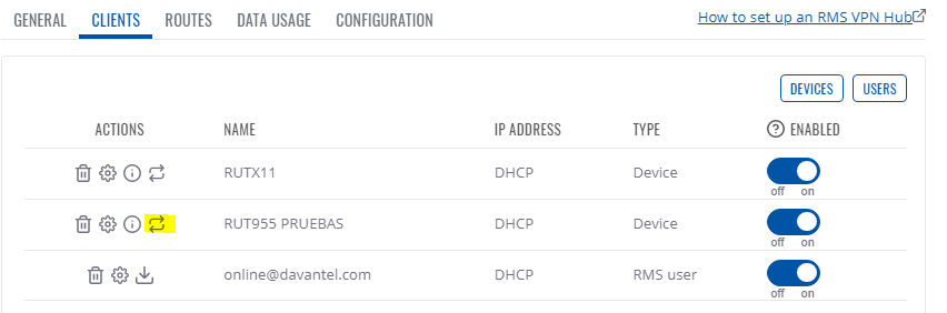 Verifica que los dispositivos están efectivamente conectados a la VPN como clientes. Tienes la información en la parte superior derecha en la ventana con los detalles del HUB.