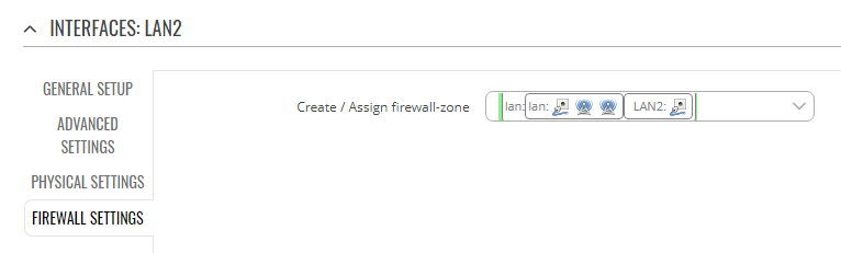 Sin embargo, es necesario añadir manualmente en el router estas LAN adicionales a la zona del firewall LAN principal para que el router permita el tráfico entre el túnel VPN y dichas interfaces. Pare ello editaremos la interfaz LAN adicional y seleccionaremos la pestaña FIREWALL SETTINGS en la parte izquierda. A continuación añadiremos las interfaces lan y LAN2 a la misma zona del firewall para que todas la reglas que aplican a la interfaz lan apliquen también a la interfaz adicional LAN2.