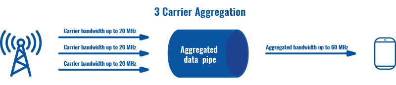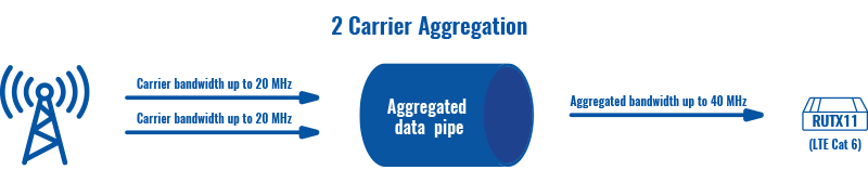 Carrier aggregation (CA) permite la asignación múltiples bloques de frecuencia a un mismo dispositivo de conexión a la red incrementando de esta forma la velocidad agregada de conexión. En este sentido 2CA es simplemente la agreación de dos bloques de frecunecias (CC).