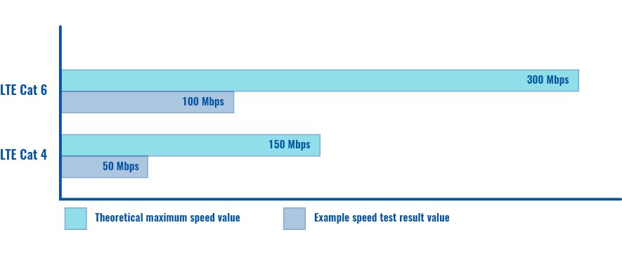 Velocidad de bajada en el dispositivo LTE Cat 6 de 100 Mbps y velocidad de bajada en el dispositivo LTE Cat 4 de 50 Mbps tal y como se muestra en el siguiente gráfico.