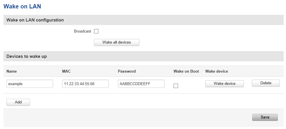 Si por el contrario queremos despertar algunos dispositivos en concreto tendremos que añadirlos entrando su dirección MAC y el password de seguridad (algunos dispositivos protegen este mecanismo con un password). También podemos marcar la opción Wake on Boot si queremos que el router, al arrancar, despierte automáticamente el dispositivo.
